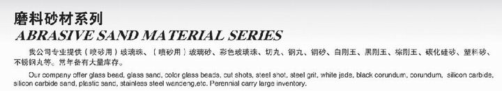 (噴砂(sha)(sha)用)玻離珠、(噴砂(sha)(sha)用)玻離砂(sha)(sha)、顏(yan)色玻離珠、切(qie)丸、鋼(gang)丸、鋼(gang)砂(sha)(sha)、白剛玉(yu)、黑(hei)剛玉(yu)、棕剛玉(yu)、炭化硅砂(sha)(sha)、材料砂(sha)(sha)、冷庫(ku)(ku)保溫隔熱板的表層(ceng)丸等。多年配備不少庫(ku)(ku)存(cun)積壓(ya)。