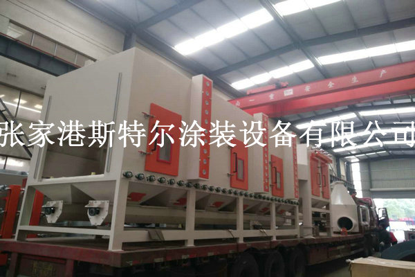 5、噴砂及時后,由工作的艙里推送滾筒機將鋼件送到拖動位后中止。