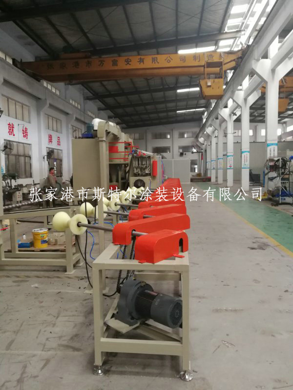 本套設備為管道自動噴砂機,由噴砂室、上料架、旋轉輸送、噴槍移動和高度調節、下料架、砂塵分離、儲料箱、除塵器及控制等幾部分組成,加工過程中管道一邊移動一邊旋轉,在噴砂區域設置移動噴砂槍32套,即可實現管道外壁的全覆蓋。整套設備采用全自動控制。為延長設備的維護周期,在主機內部斜斗處,安裝10mm耐磨板;噴砂設備采用全自動回收裝置,提升機快速回收沙料裝置,有效的無死角回收,全程監控防跑偏裝置,提高噴砂機設備的穩定性。除塵機采用防堵死專用濾筒,自動脈沖控制儀,按照不同的工礦環境設置時間。有效提高使用壽命及環保要求。該自動噴砂機配備的防滑托輥,能夠快速的將工件輸送的工作倉,并且使用壽命達到3-5年以上,為客戶在噴砂進行中的穩定性保駕護航。得到客戶的充分肯定。